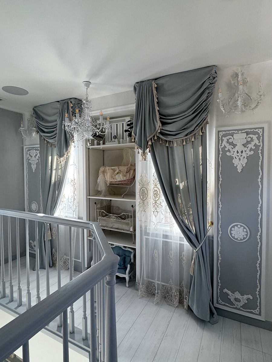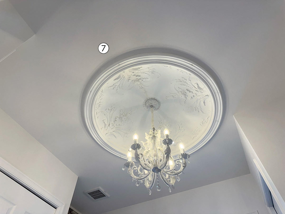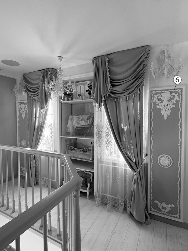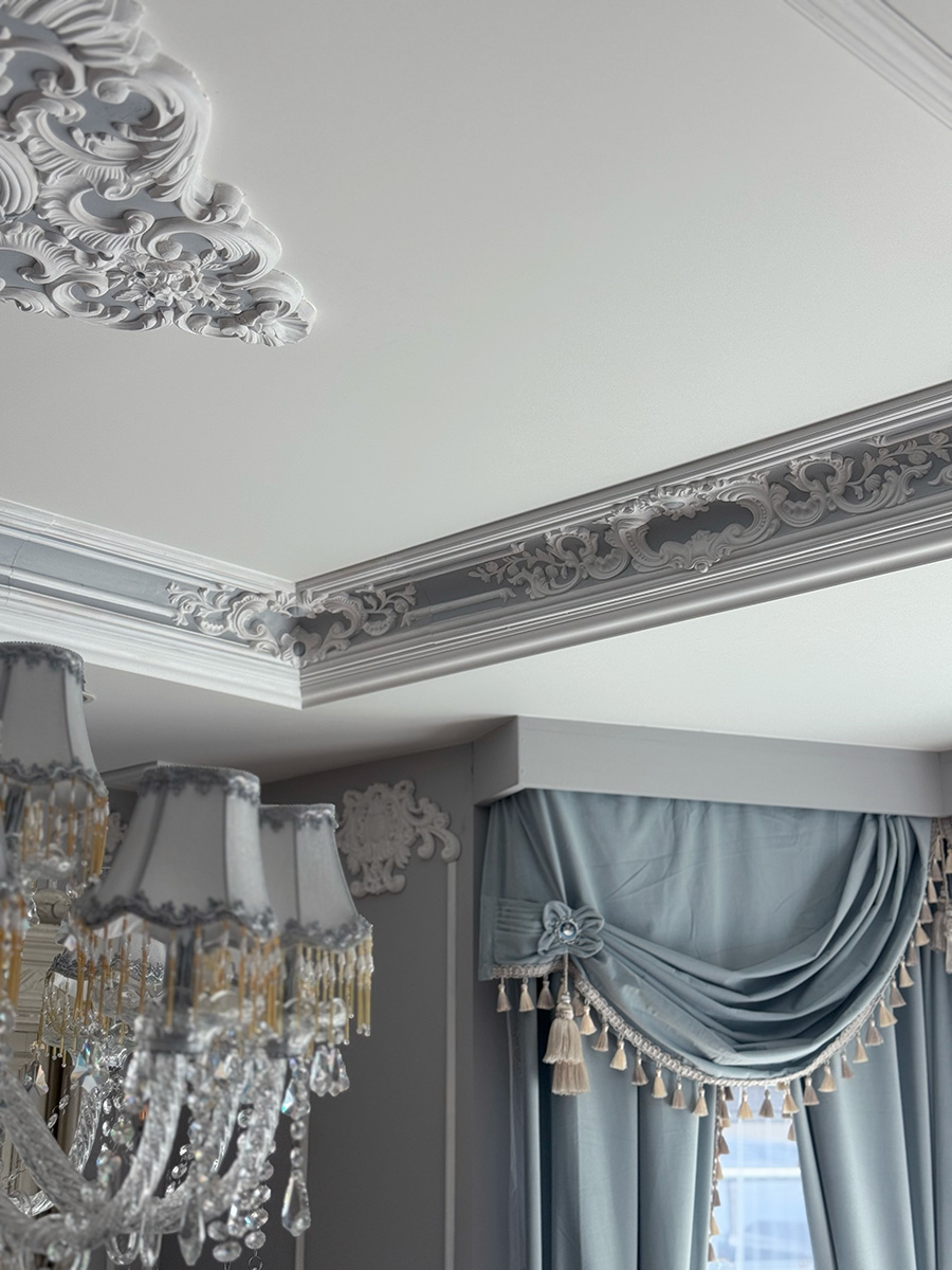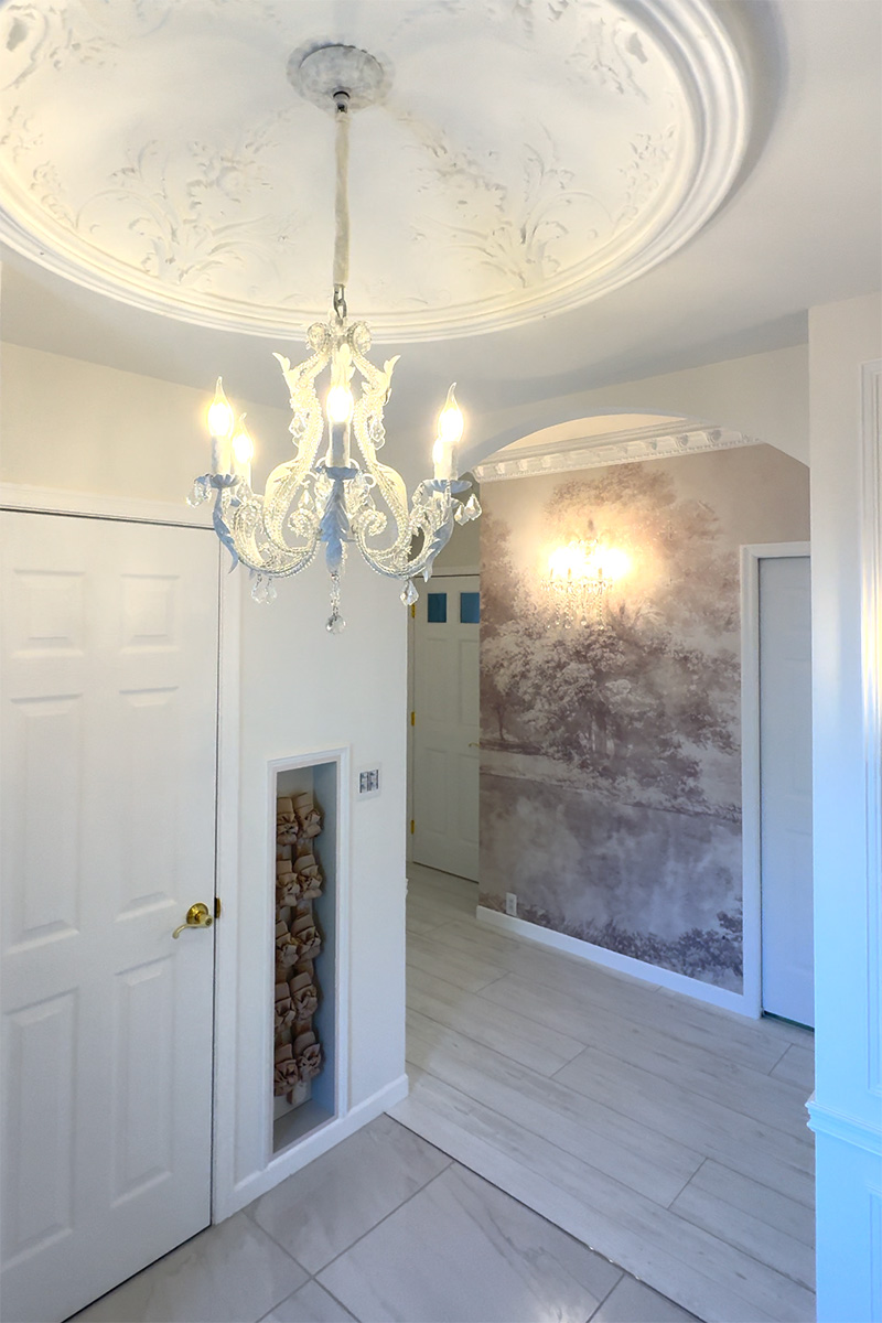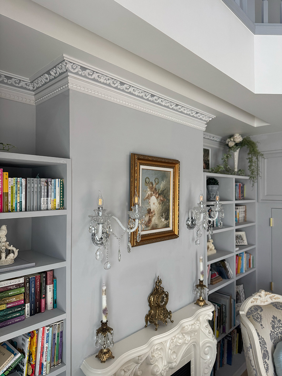 塗装が工夫されたメダリオンやモールディングが空間に新たな表情を生み出し、一層フランスのお城の空間を感じさせます。