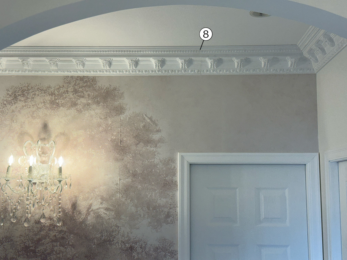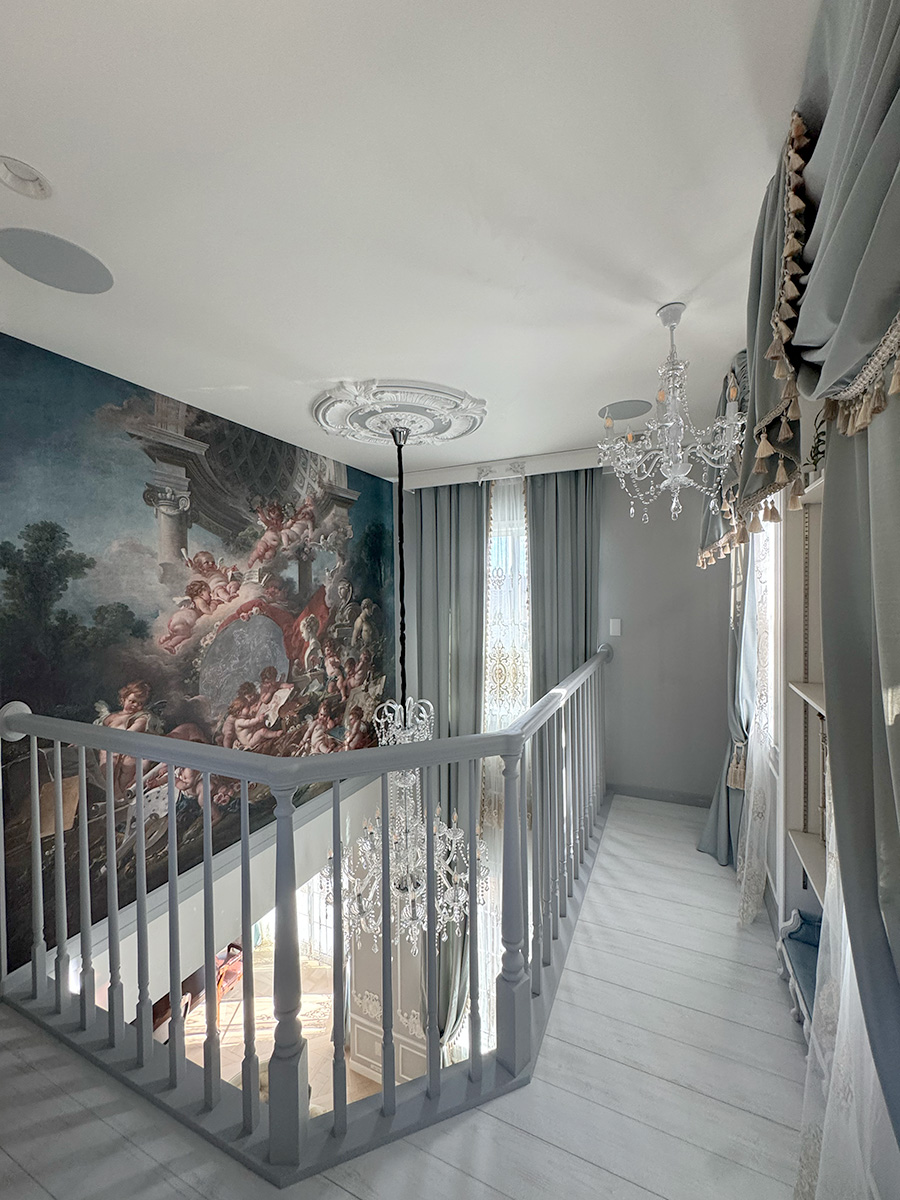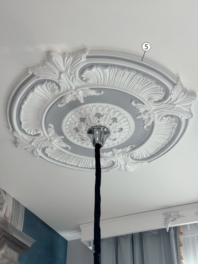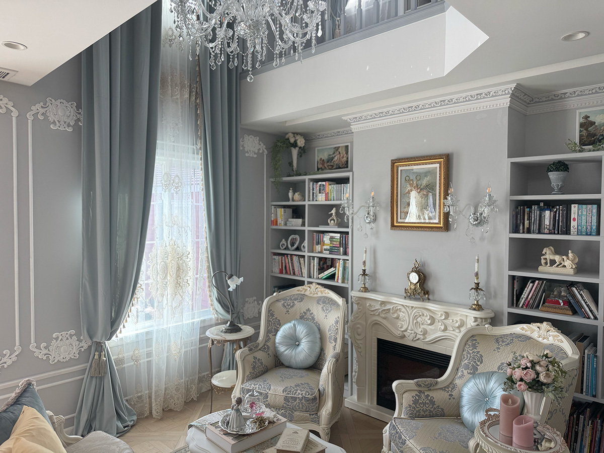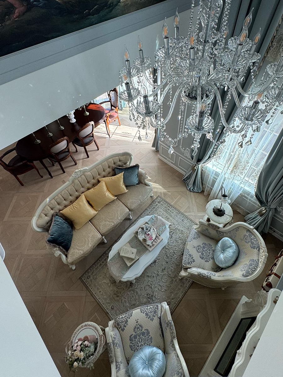 塗装が工夫されたメダリオンやモールディングが空間に新たな表情を生み出し、一層フランスのお城の空間を感じさせます。